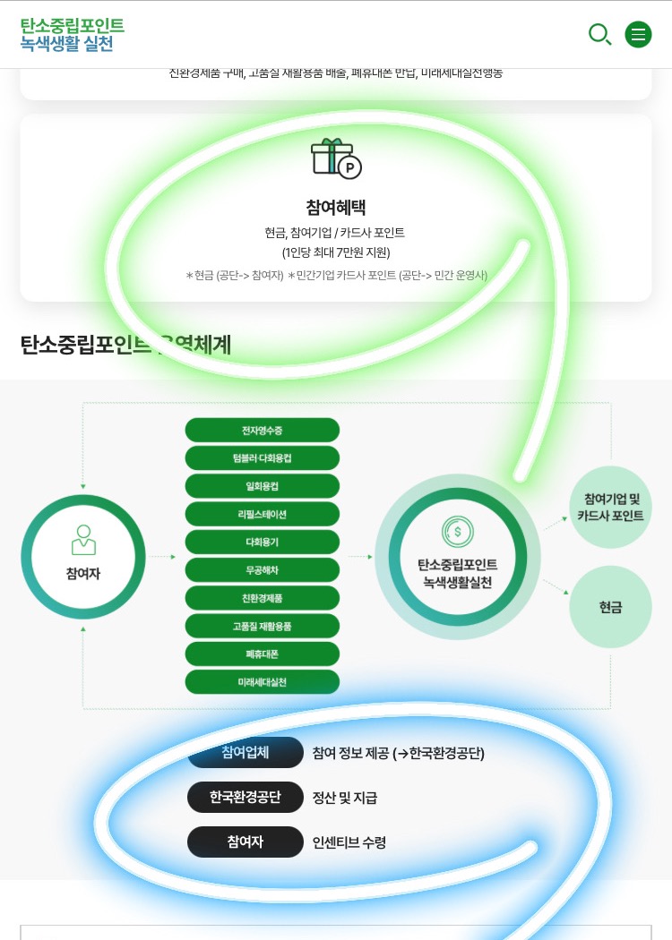 탄소중립실천포인트제 운영에 관한 규정에 따라 녹색생활 실천분야인 탄소중립포인트는 일반사람들이 손쉽게 일상생활에서 영수증이나 다회용 용기 사용 다양한 탄소중립 녹색생활 실천 활동에 따라 인센티브를 국민들에게 주는 녹색생활 운동입니다.