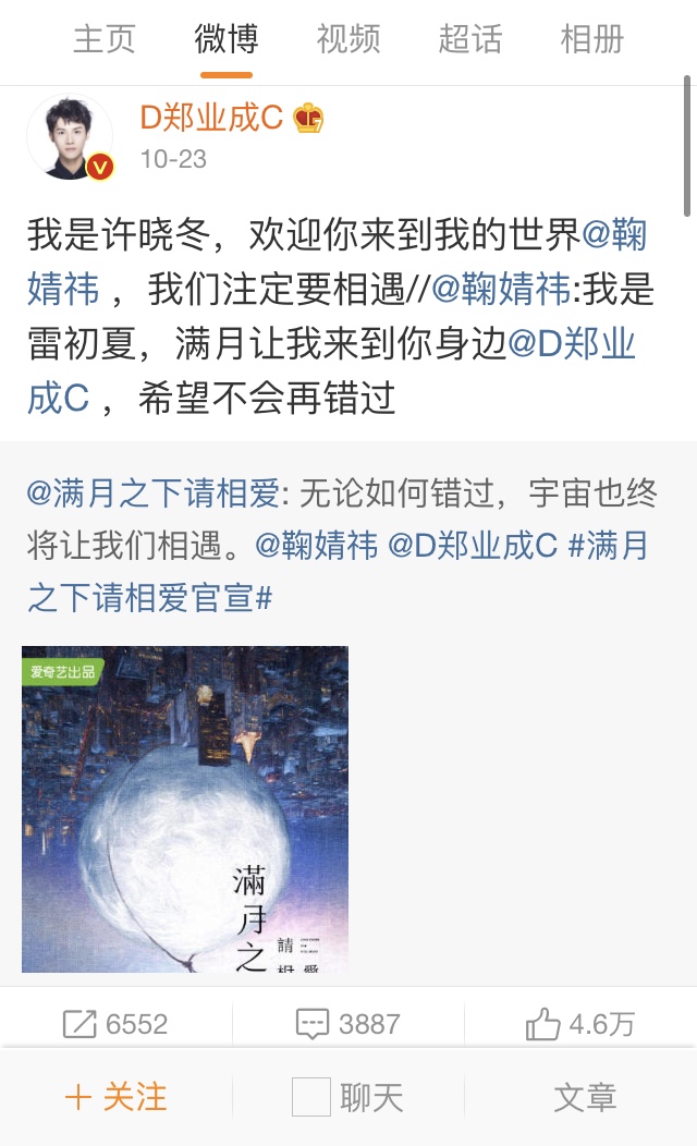 我是许晓冬,欢迎你来到我的世界@鞠婧祎 ,我们注定要相遇//@鞠婧祎:我是雷初夏,满月让我来到你身边@D郑业成C ,希望不会再错过