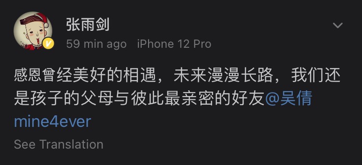 이렇게 장우검은 올렸습니다. 뭔가 일전의 중국내 스타들 이혼 발표내용과 비슷한데요. 너무 복붙같아서 진심이 쩜쩜쩜...