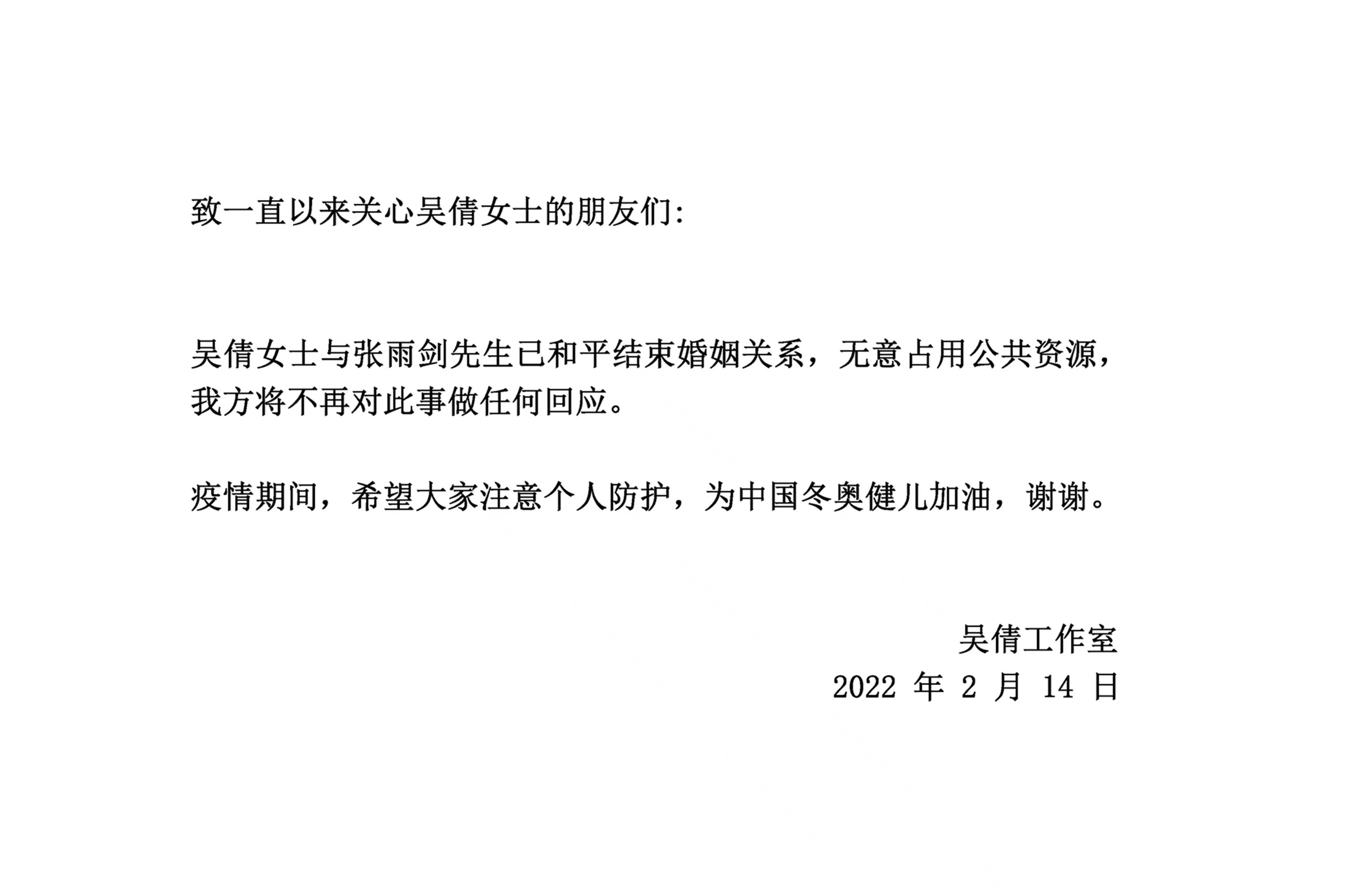致一直以来关心吴倩女士的朋友们: 吴倩女士与张雨剑先生已和平结束婚姻关系, 无意占用公共资源, 我方将不再对此事做任何回应。 疫情期间, 希望大家注意个人防护, 为中国冬奥健儿加油, 谢谢。
