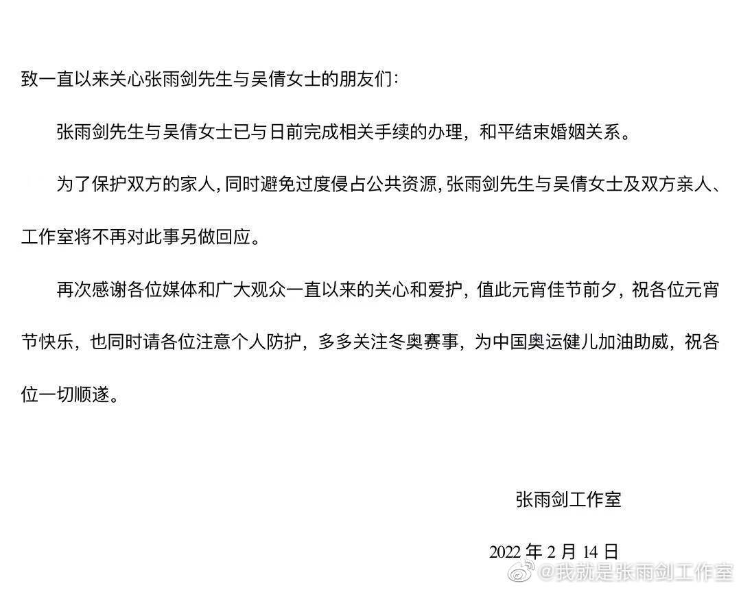 致一直以来关心张雨剑先生与吴倩女士的朋友们: 张雨剑先生与吴倩女士已与日前完成相关手续的办理, 和平结束婚姻关系。 为了保护双方的家人, 同时避免过度侵占公共资源, 张雨剑先生与吴倩女士及双方亲人、 工作室将不再对此事另做回应。 再次感谢各位媒体和广大观众一直以来的关心和爱护, 值此元宵佳节前夕, 祝各位元宵 节快乐, 也同时请各位注意个人防护, 多多关注冬奥赛事, 为中国奥运健儿加油助威, 祝各 位一切顺遂。