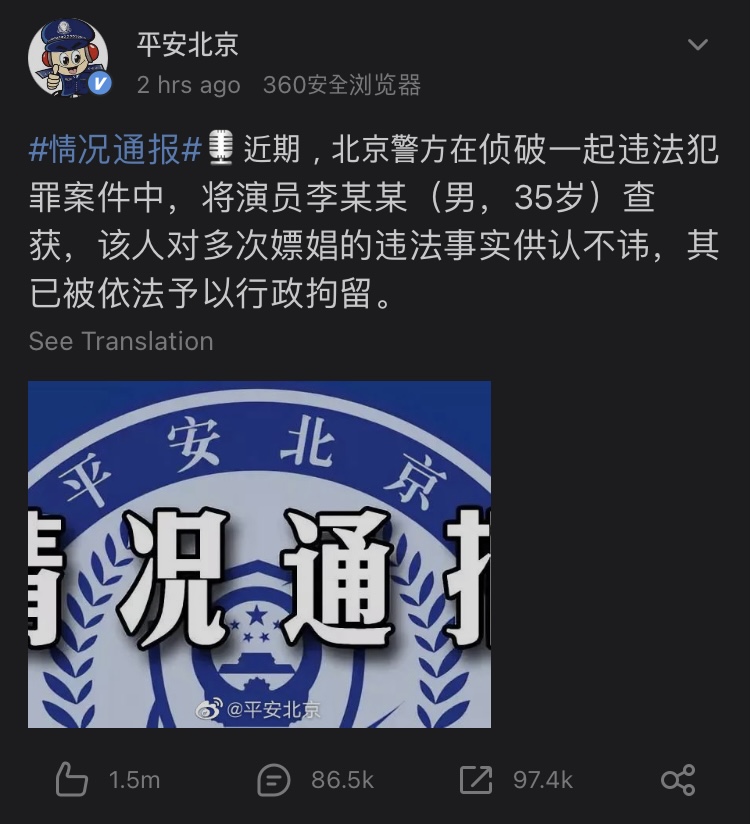 @평안베이징에 따르면 베이징 경찰은 최근 배우 이모 씨(35)를 체포해 여러 차례 s매수 사실을 시인한 혐의로 구속했다.